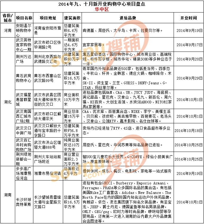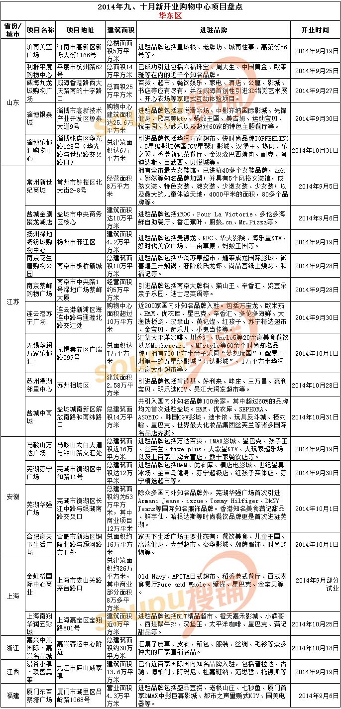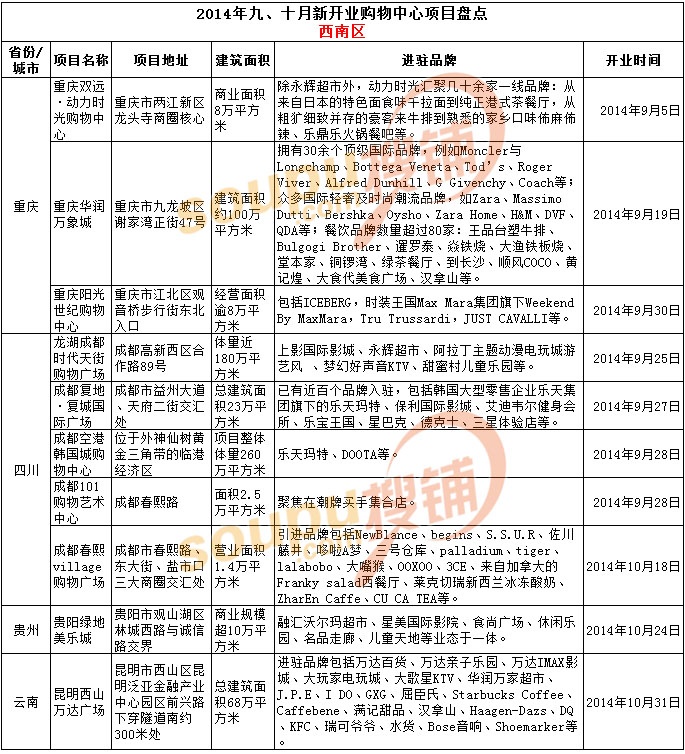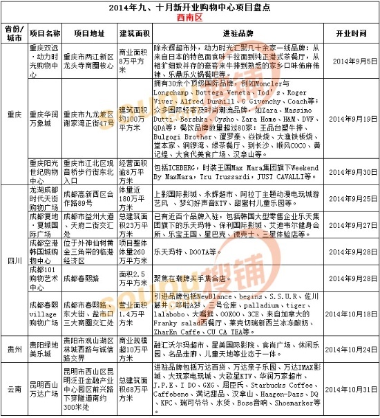 據(jù)搜鋪網(wǎng)統(tǒng)計(jì),在2014年9-10月份,全國(guó)新開業(yè)購(gòu)物中心項(xiàng)目超過(guò)80家。萬(wàn)達(dá)、歐亞、中糧、恒隆、蘇寧、銀泰、武商、步步高、萬(wàn)科、華潤(rùn)等十余家巨頭皆有新項(xiàng)目投入運(yùn)營(yíng)。其中,新開業(yè)項(xiàng)目最多的集團(tuán)為萬(wàn)達(dá)(荊州萬(wàn)達(dá)廣場(chǎng)、馬鞍山萬(wàn)達(dá)廣場(chǎng)、東莞東城萬(wàn)達(dá)廣場(chǎng)、蘭州萬(wàn)達(dá)廣場(chǎng)、昆明西山萬(wàn)達(dá)廣場(chǎng)),新開業(yè)項(xiàng)目最多的城市為成都。
