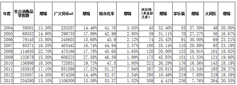 在數(shù)據(jù)上,我為了體現(xiàn)宏觀和微觀的對應(yīng),分別尋找了3組宏觀數(shù)據(jù)和3組微觀數(shù)據(jù),宏觀數(shù)據(jù)分別是社零總額,廣義貨幣和城市化率;微觀數(shù)據(jù)找了三個有代表的性的超市(super market)。數(shù)據(jù)的起始點(diǎn)是從具有時代意義的2004年到2013年,很巧合,正好是一個10年。