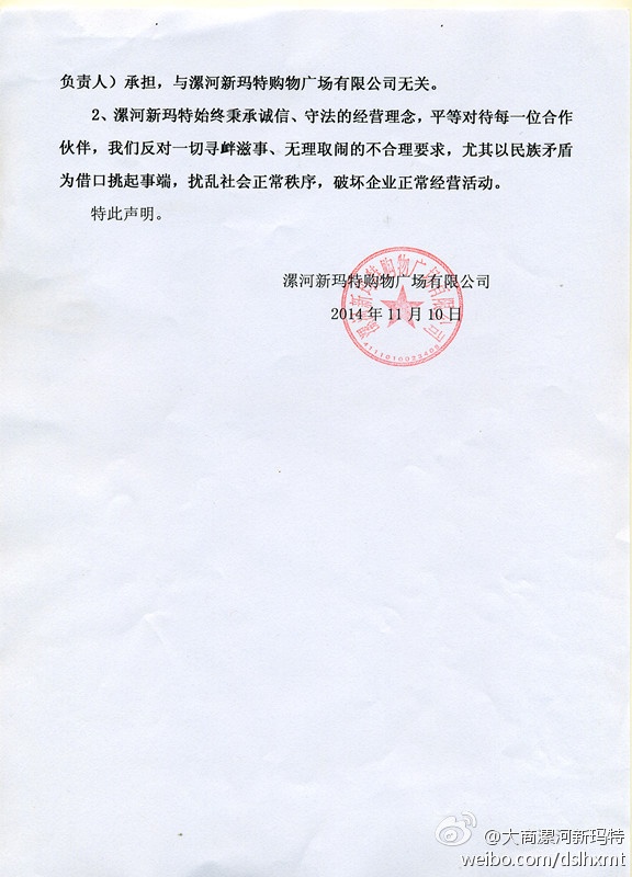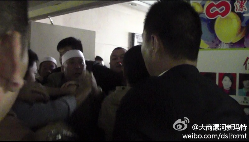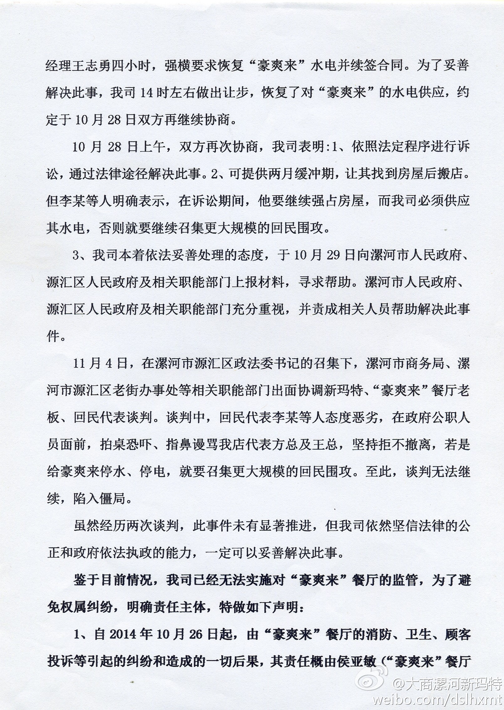 11月4日,在漯河市源匯區(qū)政法委書記的召集下,漯河市商務(wù)局、漯河市源匯區(qū)老街辦事處等相關(guān)職能部門出面協(xié)調(diào)新瑪特、“豪爽來”餐廳老板、回民代表談判。談判中,回民代表李某等人態(tài)度惡劣,在政府公職人員面前,拍桌恐嚇、指鼻謾罵我店代表方總及王總,堅(jiān)持拒不撤離,若是給豪爽來停水、停電,就要召集更大規(guī)模的回民圍攻。至此,談判無法繼續(xù),陷入僵局。