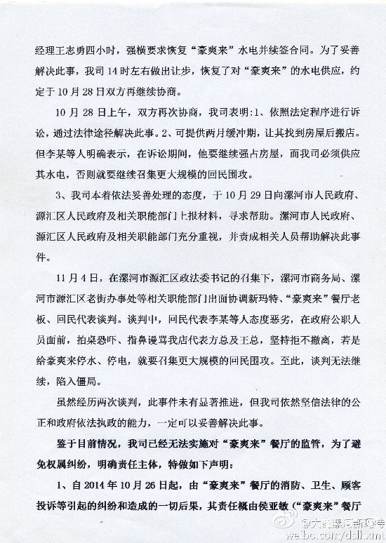 鑒于目前情況,我司已經(jīng)無法實(shí)施對(duì)“豪爽來”餐廳的監(jiān)管,為了避免權(quán)屬糾紛,明確責(zé)任主體,特做如下聲明: