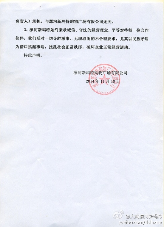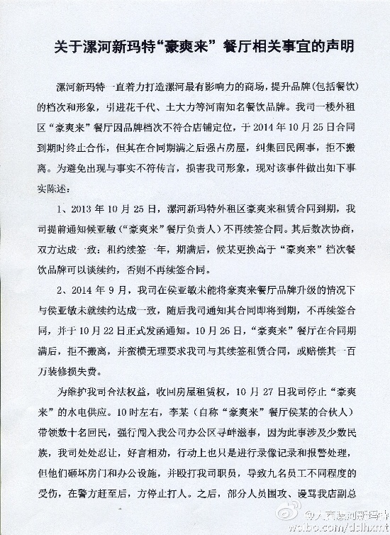 聯(lián)商網(wǎng)消息:漯河新瑪特一直著力打造漯河最有影響力的商場,提升品牌(包括餐飲)的檔次和形象,引進(jìn)花千代、土大力等河南知名餐飲品牌。我司一樓外租區(qū)“豪爽來”餐廳因品牌檔次不符合店鋪定位,于2014年10月25日合同到期時(shí)終止合作,但其在合同期滿之后強(qiáng)占房屋,糾集回民鬧事,拒不搬離。為避免出現(xiàn)與事實(shí)不符傳言,損害我司形象,現(xiàn)對(duì)該事件做出如下事實(shí)陳述: