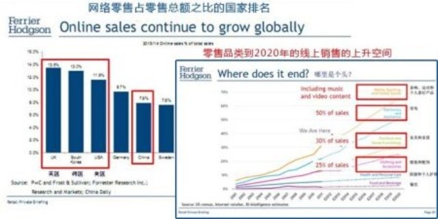 2、線上銷(xiāo)售的發(fā)展畢竟還是有限高的。馬王之賭在國(guó)內(nèi)引出了這個(gè)熱議的話題,但是稍有零售專(zhuān)業(yè)背景和商業(yè)大局觀的人都明白線上的銷(xiāo)售將取代線下銷(xiāo)售達(dá)50%是完全不可能的,永遠(yuǎn)也達(dá)不到這個(gè)比例。看一下互聯(lián)網(wǎng)發(fā)達(dá)和成熟的國(guó)家,盡管這些年線上銷(xiāo)售的增長(zhǎng)也很快,但占零售總額比例也就百分之十幾而已。
