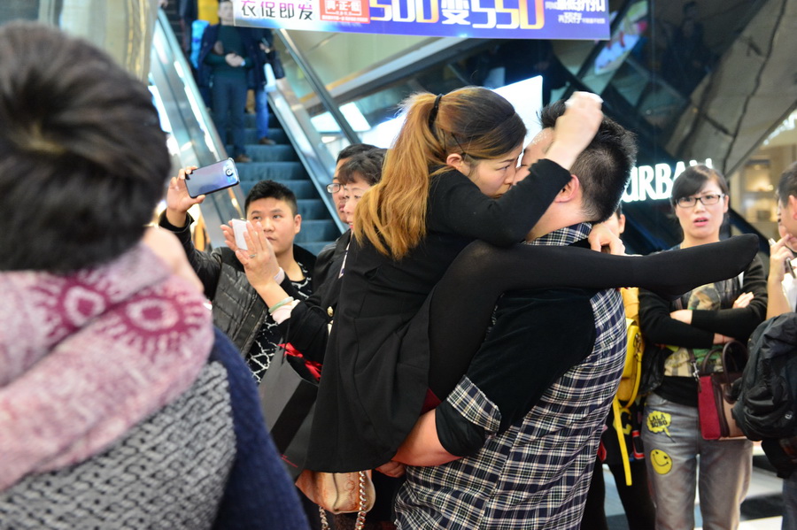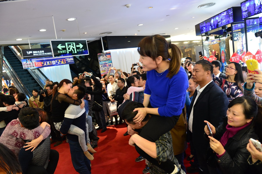 當(dāng)天的比賽從下午一直延續(xù)到深夜,盡管比賽制定了“女方身體必須懸空”、“雙方必須始終吻在一起”等苛刻規(guī)則,但熱情的選手們還是或抱或背或蹲或扛各種奇葩姿勢(shì)參賽,一對(duì)情侶女方還將雙腿架在男方肩上,“高難度”吻姿吸引了無(wú)數(shù)市民快樂圍觀;顒(dòng)現(xiàn)場(chǎng),不少顧客拿出手機(jī)、相機(jī)拍照攝影,利用門店的免費(fèi)WIFI分享到微信、QQ,為無(wú)數(shù)個(gè)朋友圈增添甜蜜、浪漫話題,賺取點(diǎn)贊無(wú)數(shù),F(xiàn)場(chǎng)纏綿悱惻、難舍難分的氣氛感染不少年輕情侶,有的還情不自禁地親吻起來(lái)。