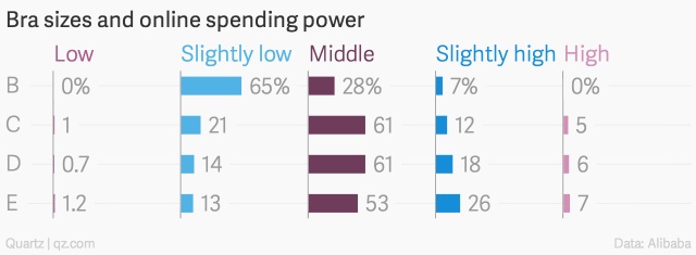 夏初,數(shù)據(jù)分析師在分析阿里巴巴內(nèi)衣銷量的時候發(fā)現(xiàn)一個有趣的趨勢:購買內(nèi)衣罩杯越大的女性花的錢越多。阿里巴巴分析師將內(nèi)衣消費者按其購買能力分成了四類,他們發(fā)現(xiàn)65%的B罩杯女性都屬于“購買能力低”這一類,而C及以上罩杯的女性大部分購買能力都是“中等”或以上。