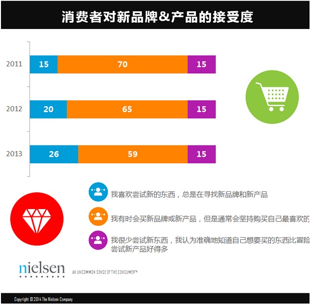 與此同時,尼爾森的研究顯示,在過去三年里愿意嘗試新品牌或新產(chǎn)品的消費者也在增加,從前一年的15%躍升至如今的26%。與此同時,偶爾嘗試新品牌新產(chǎn)品但通常更傾向于自己喜愛的品牌的這一類消費者比例則從過去的70%下降到今年的59%。