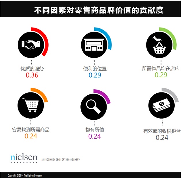 尼爾森調(diào)查顯示,“便利的位置”對于零售商品牌價值的貢獻(xiàn)度緊隨“優(yōu)質(zhì)的服務(wù)”之后,位居第二。其次是“可以很容易、并很快找到我需要的東西”,“能在一個門店找到我想要的所有東西”、及“有效率的收銀柜臺”。值得一提的是,能夠提供“所需物品均在店內(nèi)”服務(wù)的零售店的排名從前一年的第13位一躍成為排名第4的品牌價值影響要素,與此同時,“有效率的收銀柜臺”也從去年的第15名躍居為如今的第6名。