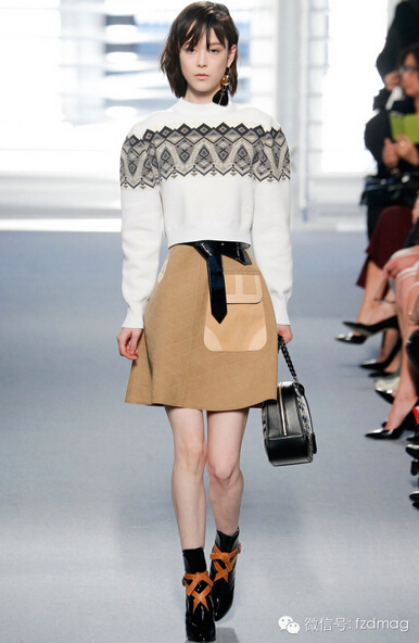 七零年代盛行的菱格紋毛衣本季大回歸,那時(shí)美國富裕家庭去滑雪勝地亞斯本(Aspen)度假時(shí)最愛穿此類衣服,這一季伸展臺(tái)上的菱格紋毛衣則是城市鄉(xiāng)間兩相宜,如Louis Vuitton配上皮裙。