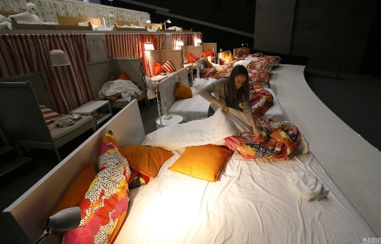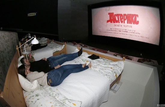 當(dāng)?shù)貢r間2014年12月7日,俄羅斯莫斯科郊區(qū)希姆基,家具零售商宜家將一處電影院內(nèi)的座椅全部更換為宜家家居,17張雙人床讓觀眾可以躺著觀看電影。電影院的名字也被更換為“喚醒愛”。