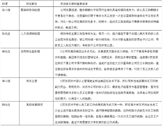 另一方面,筆者又對(duì)目前仍在職的核心員工進(jìn)行了訪談?wù){(diào)研,進(jìn)一步了解這些員工對(duì)D公司的整體感受以及他們對(duì)昔日同事選擇離職的看法,目的是為了從不同視角來(lái)透析導(dǎo)致核心員工離職的復(fù)雜心理因素和企業(yè)因素,訪談結(jié)果見(jiàn)下表。