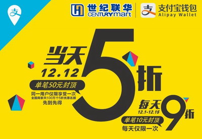 同時,還有個好消息要告訴大家,今天(12月12日)全天,所有在浙江省內世紀聯(lián)華及聯(lián)華超市門店購物并使用支付寶錢包付款的用戶,全部可以享受“專享5折”優(yōu)惠,優(yōu)惠封頂金額50元(活動細則不變,每個用戶可享受一次,同一支付寶賬戶、銀行卡、身份證、手機號、手機終端,均視為同一用戶)。