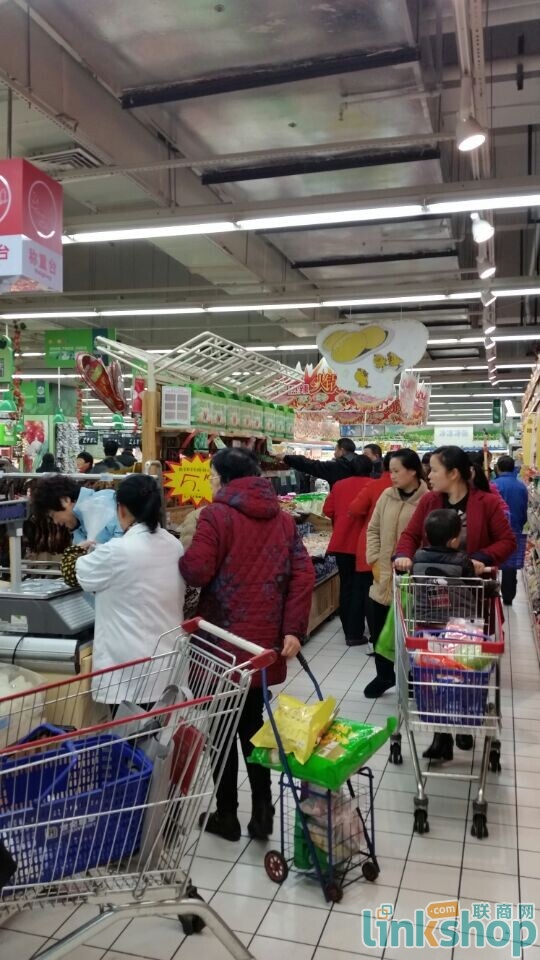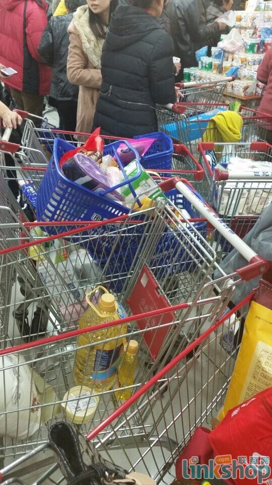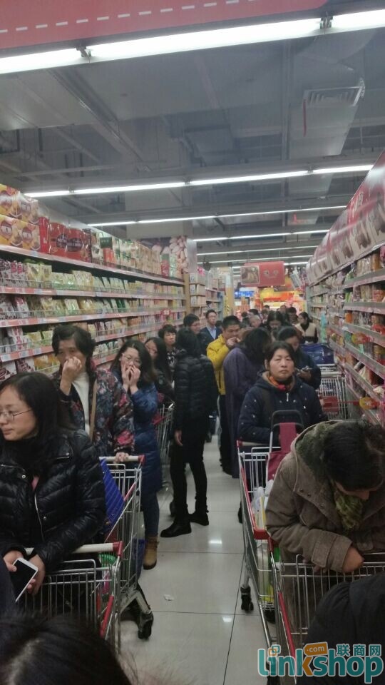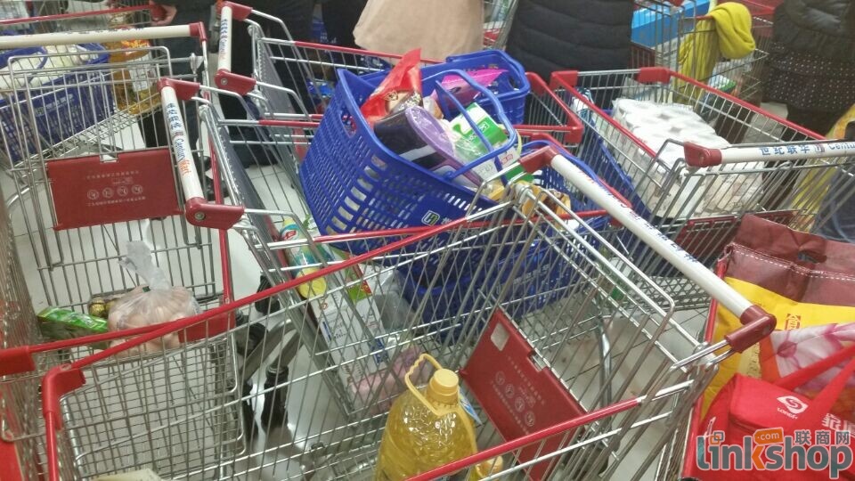 聯(lián)商網(wǎng)記者來(lái)到位于杭州濱江的世紀(jì)聯(lián)華江暉店,雖然早有心理準(zhǔn)備,但還是被火爆的場(chǎng)面驚呆了。整個(gè)賣場(chǎng)內(nèi)人滿為患,20多個(gè)收銀臺(tái)都排起了長(zhǎng)隊(duì),每個(gè)隊(duì)伍足有20米長(zhǎng),多數(shù)人準(zhǔn)備用支付寶進(jìn)行支付,包括部分年紀(jì)偏大的中老年人。記者目測(cè),在消費(fèi)者所購(gòu)商品中,大米、食用油、日用品及食品比重相對(duì)較大。據(jù)了解,排隊(duì)完成支付大約需要1個(gè)半小時(shí)左右。