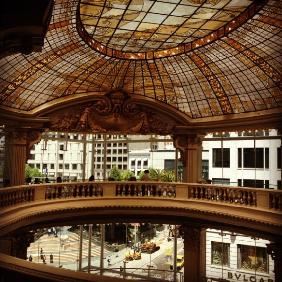 該百貨公司商品以豪華炫麗著稱,內(nèi)部的裝潢也金碧輝煌,圖形屋頂上有一天窗,以彩色玻璃鑲嵌出古巴黎市的圖案,是舊金山的名景之一。