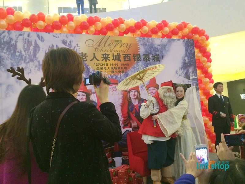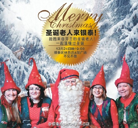 2.銀泰百貨。今年圣誕節(jié),銀泰百貨邀請了來自芬蘭的圣誕老人,顧客可以和圣誕老人合影留念。