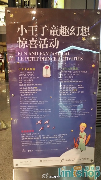 2014年11月21日至1月4日,僑福芳草地推出以法國作家、詩人、飛行員安托萬·德·圣?颂K佩里的代表作《小王子》為主題的圣誕活動,將整個商場化身為奇妙的童話世界。除了放置于商場LG2中庭廣場的巨型小王子植物雕塑,以及可愛的紅色螺旋槳飛機(jī)外,主背景板上那句“所有大人都曾是小孩,可惜,只有很少的大人能夠記住這事”更是引起了不少顧客的共鳴。