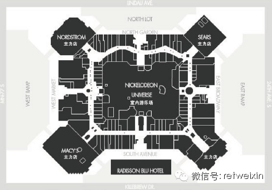 Mall of America中庭布局Nickelodeon Universe主題樂園,周邊區(qū)域及各樓層則有水族館、高爾夫球場及電影院等商業(yè)娛樂設(shè)施,整個購物中心公共空間和娛樂業(yè)態(tài)融為一體。公共空間內(nèi)加入娛樂設(shè)施這一巧妙設(shè)計(jì)能夠放大公共空間的休閑特質(zhì),更大突出購物中心體驗(yàn)的特色,改變著購物中心整體“氣質(zhì)”,形成獨(dú)特吸引力。Mall of America 年均客流量4,250萬人次,其中專程為了主題樂園而來的觀光客達(dá)到40%;同時,公共空間如此布局能夠和周圍業(yè)態(tài)相輔相成,刻意突出的娛樂主題,帶動購物中心內(nèi)主題商店、主題餐飲、運(yùn)動酒吧等類零售及餐飲業(yè)態(tài)的消費(fèi)。