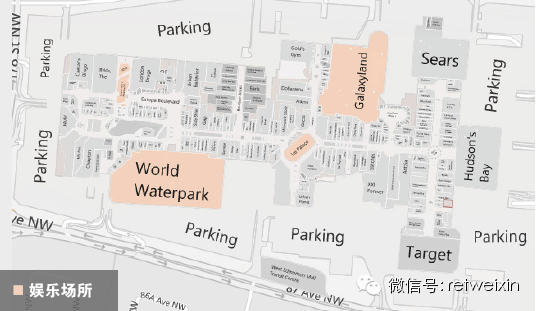相比之下,West Edmonton Mall 在公共空間的設(shè)計(jì)中,規(guī)劃了四個不同主題的娛樂場所,更像是購物中心里的“主力店”,周邊圍繞著各種規(guī)模的零售店鋪,以起到將不同購物區(qū)自然銜接的作用。West Edmonton Mall 以娛樂為吸引游客的主要賣點(diǎn),既豐富了公共空間的內(nèi)容,又延長了顧客停留時間,增加消費(fèi)幾率。