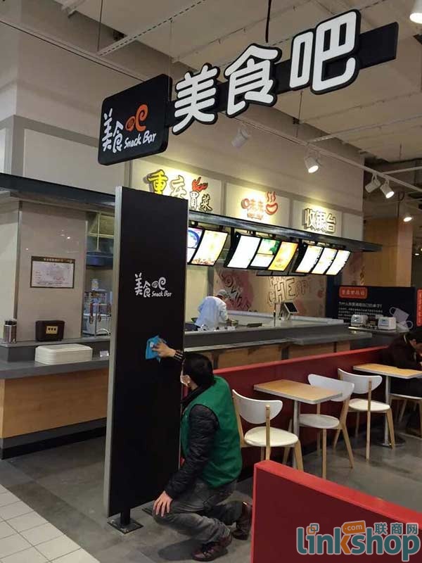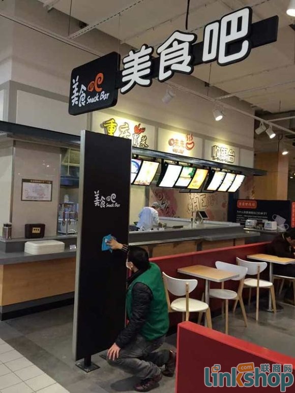 工作人員在對(duì)賣(mài)場(chǎng)內(nèi)美食吧做最后的清理檢查。