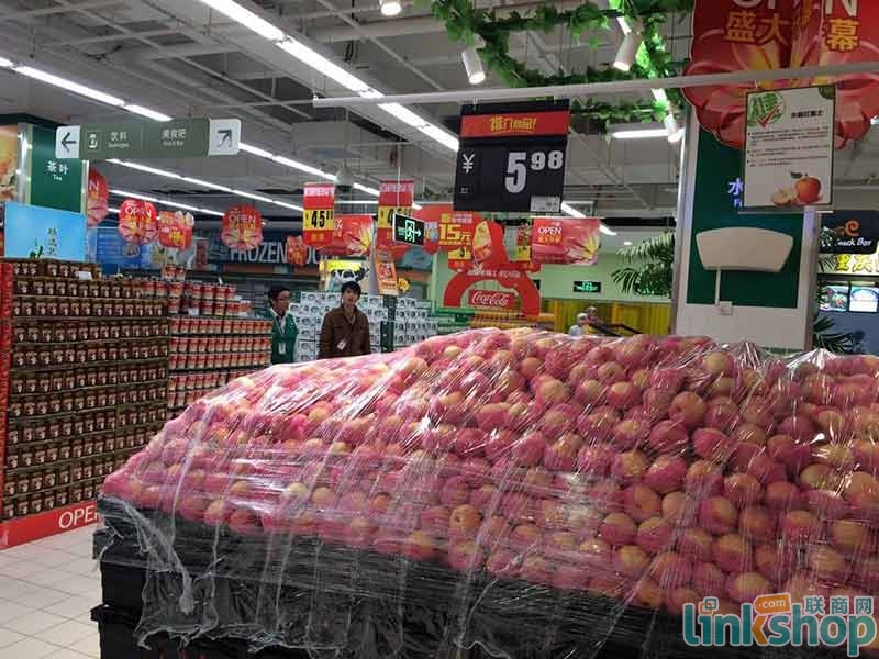 水果區(qū)蘋(píng)果被碼放得整整齊齊,覆蓋其上的保護(hù)膜正等待著第二天一早被揭開(kāi)。