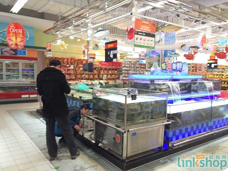 開(kāi)業(yè)前晚,超市水產(chǎn)區(qū),工作人員正在檢查地面排水功能的情況。