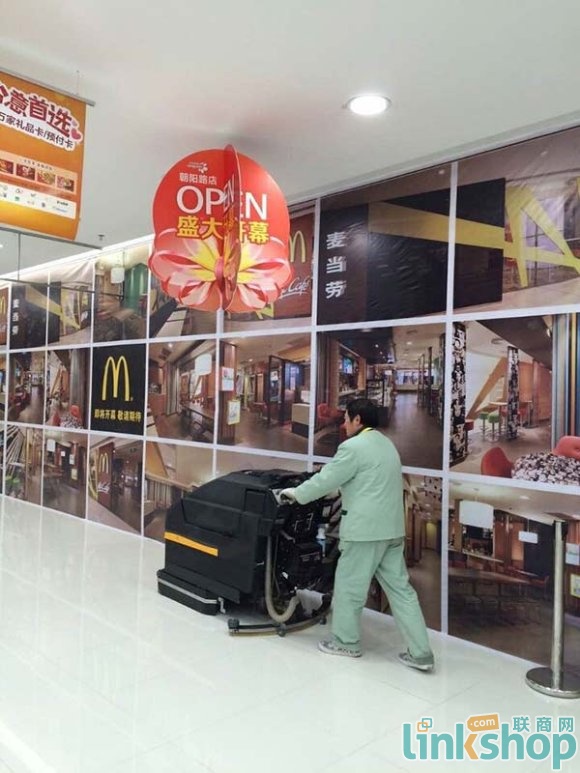 工作人員在麥當(dāng)勞附近進(jìn)行地面清潔