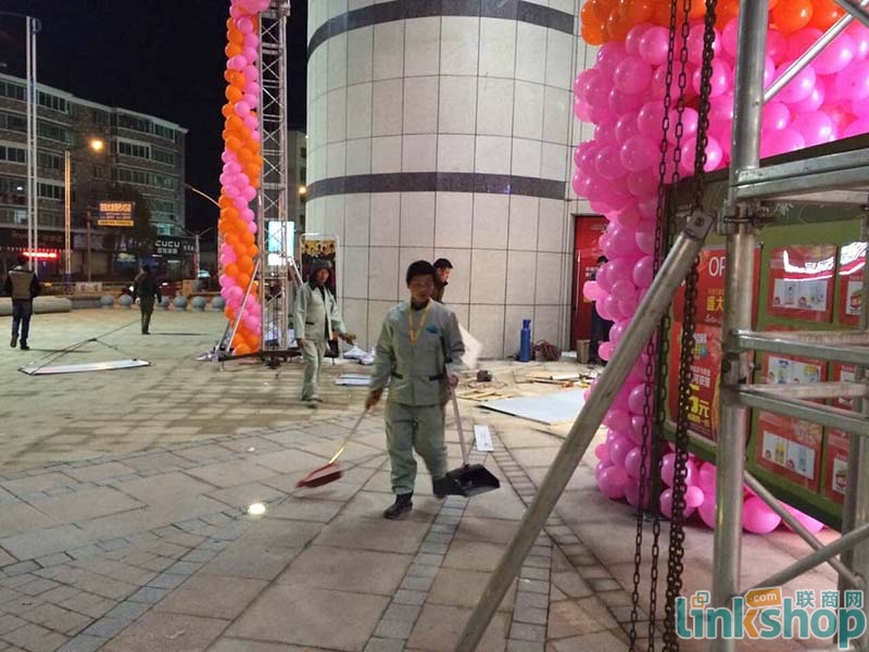 賣(mài)場(chǎng)室外的清潔工作也在緊張的開(kāi)展,旁邊是已經(jīng)搭好了第二天開(kāi)業(yè)慶典使用的氣球門(mén),預(yù)示著這家3萬(wàn)平方米的大賣(mài)場(chǎng)要正式營(yíng)業(yè)了!