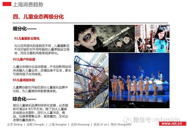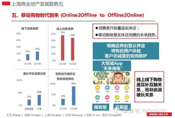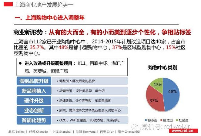 RET睿意德分析指出,2014年,上海購物中心進入調(diào)整年,已開業(yè)的112家購物中心,40家已經(jīng)或計劃升級;大型高端餐飲開始撤離購物中心,中小型大眾餐飲取而代之;上海是中國最“甜”的城市,也是買手店最活躍的城市,在上海的購物中心中,參與性、戲劇性、儀式感正在逐漸加強;23個新興板塊中,浦東邊郊發(fā)展?jié)摿ψ畲,寶山、青浦緊隨其后,他們最有可能成為下一個“徐家匯”;隨著信貸資產(chǎn)證券化業(yè)務(wù)由審批制改為業(yè)務(wù)備案制,多元化的金融手段將為商業(yè)地產(chǎn)提供新的融資渠道和退出機制,中國商業(yè)地產(chǎn)金融驅(qū)動的模式將在未來兩到三年成為主流。
