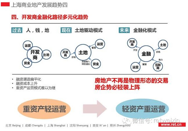 圍繞著人、錢、地三大資源,中國商業(yè)地產(chǎn)開發(fā)經(jīng)歷三輪基本驅(qū)動。最初,開發(fā)商占主導(dǎo)地位,尋找成本低的土地和資本,組建合適團隊;此后,模式更迭到以土地為基本驅(qū)動,開發(fā)商、資本方、運營團隊專業(yè)分工各司其職,職業(yè)經(jīng)理人開始顯現(xiàn)價值,F(xiàn)在,以金融為驅(qū)動的模式正在顯現(xiàn),商業(yè)銀行、股票市場、債券市場和投資信托市場不斷豐富著商業(yè)地產(chǎn)的融資方式。未來兩到三年,金融驅(qū)動模式將成為主流,萬科“輕資產(chǎn)”模式和“凱德模式”將逐漸增多。