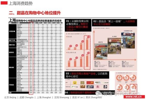 RET睿意德中國商業(yè)地產(chǎn)研究中心在對6個品類45個跨城市發(fā)展的甜品品牌深入研究之后發(fā)現(xiàn),進駐上海購物中心的甜品品牌店鋪有549家,比位居第二的北京多出257家。上海是中國最“甜”的城市。與此同時,在眾多餐飲品類中,甜品正從輔助型商業(yè)轉(zhuǎn)型為必備型商業(yè),其在購物中心的業(yè)態(tài)占比從8%上升至14%,在餐飲中的占比中也從29%上升至36%。一些高端的甜品店甚至入駐購物中心首層,與奢侈品為鄰,如港匯一樓的LADUREE、Godiva。