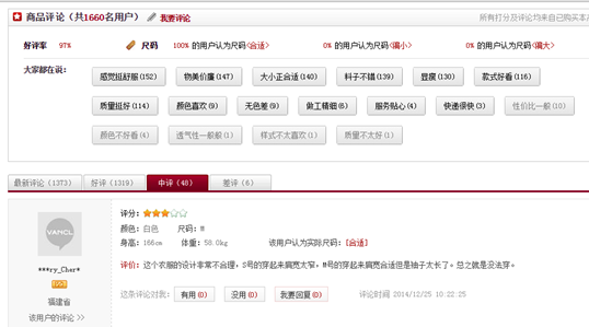 一是只有凡客實現(xiàn)是用身高體重連衡量衣服是否合身的功能;天貓店也有評價衣服偏大、偏小還有合身的項目,但是身高體重通通沒有,那可以講,有個p用。