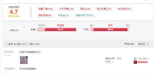 二是凡客的好、中、差評論明確較天貓和其自營網(wǎng)站要厚道,自營店我干脆就沒找到差評,天貓找差評也不清晰,京東還算好,畢竟是seller,雖然沒有詳細的針對評價,但最起碼能讓我方便的找到差評。