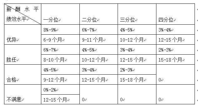從表中可以看出,績效水平較高的員工所獲得的加薪幅度較大而且頻率更高,而績效一般和績效低于一般水平的員工則需要等待很長的時間才能獲得加薪,而且加薪的幅度很低。