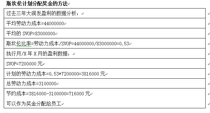 斯坎倫計劃是利用員工和管理層委員會在成本降低方面取得進(jìn)展進(jìn)行激勵。實(shí)際的公式數(shù)據(jù)要根據(jù)公司的具體需要進(jìn)行設(shè)計,一般來說,公司都以勞動力成本與生產(chǎn)銷售價值的比率為依據(jù)。假定SVOP等于銷售收入和庫存產(chǎn)品價值的總和。