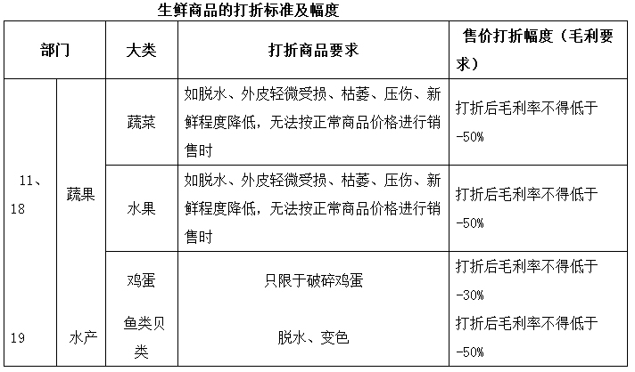 9.每次盤點結束二天內(nèi),部門主管需統(tǒng)計打折后的數(shù)量級金額,損耗占比,折扣占比并提報至地區(qū)生鮮營運中心。