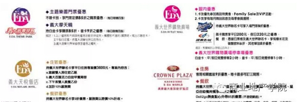 義大世界聯(lián)名卡:通過(guò)發(fā)放聯(lián)名卡,使義大世界購(gòu)物廣場(chǎng)、義大游樂(lè)世界、義大天悅飯店、義大皇冠假日飯店等物業(yè)項(xiàng)目相互聯(lián)動(dòng)起來(lái),促進(jìn)消費(fèi)者消費(fèi)。