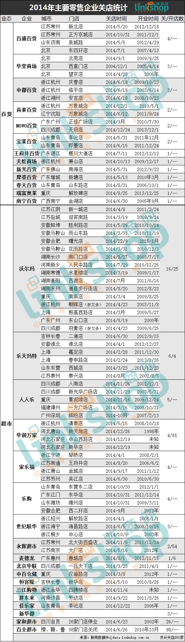 據(jù)聯(lián)商網(wǎng)統(tǒng)計,截止2014年12月31日,全國主要零售企業(yè)(百貨、超市)共計關(guān)閉201家門店,較2013年關(guān)閉35家,同比增長474.29%,創(chuàng)歷年之最。