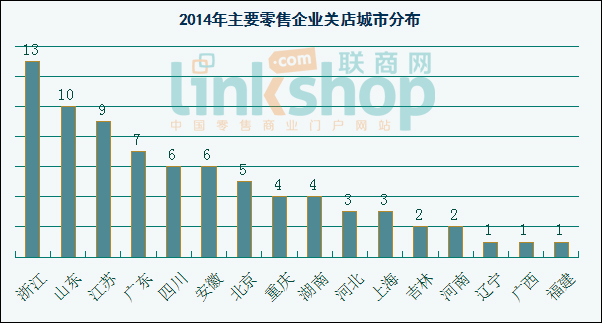 值得關(guān)注的是,在關(guān)店統(tǒng)計中,外資零售關(guān)店141家占總數(shù)的70%,內(nèi)資零售關(guān)店60家,占關(guān)店總數(shù)的30%。在關(guān)店城市分布中,浙江共計關(guān)閉13家零售門店,山東關(guān)閉10家,江蘇關(guān)閉9家,成為2014年關(guān)店排名前三城市。