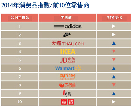 歐析咨詢(OC&C Strategy Consultants,下稱OC&C)最新發(fā)布了《2014年OC&C中國零售消費(fèi)品指數(shù)調(diào)研》報告。根據(jù)調(diào)研結(jié)果,在中國消費(fèi)者心中,最受喜愛的零售商是阿迪達(dá)斯,前10大品牌中,國內(nèi)電商一共占據(jù)了4席,分別是天貓、京東、一號店和淘寶。