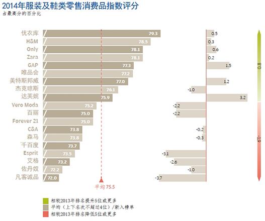 在服裝品類上,優(yōu)衣庫同去年一樣排名第一,并同競爭者們進(jìn)一步拉開差距。總體而言,這一品類的兩極分化正在加劇,贏家和輸家的評分差距越來越大。