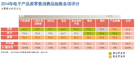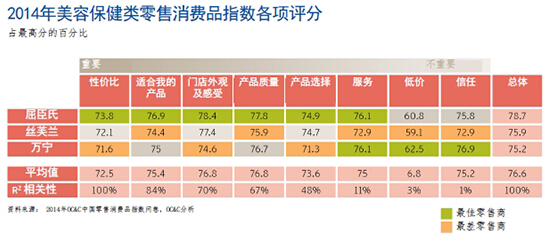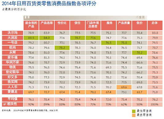 2014年OC&C中國零售消費(fèi)品指數(shù)在全國范圍內(nèi)調(diào)研了兩千多位消費(fèi)者,讓他們選出自己最喜愛的零售品牌,并校對整理了針對5個零售種類(運(yùn)動服飾、日用百貨、服飾、純電商及電子產(chǎn)品零售商),以及53個商家的兩萬多份消費(fèi)者評分。