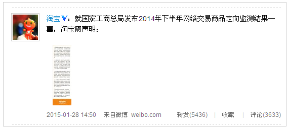 就國(guó)家工商總局發(fā)布2014年下半年網(wǎng)絡(luò)交易商品定向監(jiān)測(cè)結(jié)果一事,淘寶網(wǎng)聲明: