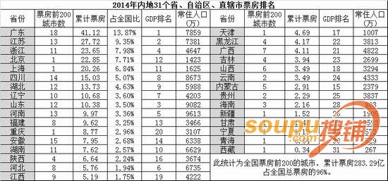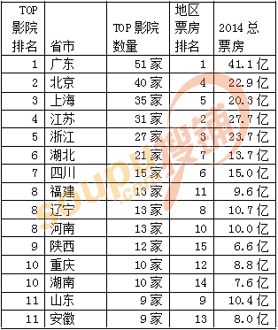 廣東、江蘇、浙江是全國三大主要票倉,北京、上海兩大都市的票房則富可敵省。一個地區(qū)擁有TOP影院數(shù)量排名大致與該地區(qū)的總票房排名呈正相關(guān)性,浙江、江蘇、山東的TOP影院排名落后于其地區(qū)票房排名,顯示這些地區(qū),影院競爭尚不是非常激烈,有較大發(fā)展商機。而陜西、福建等地區(qū)情況恰恰相反,TOP影院排名領(lǐng)先于于其地區(qū)票房排名,顯示這些城市,影院的市場集中度較高,競爭已經(jīng)較為激烈。而就GDP和人口總量數(shù)據(jù)來看,山東、河南、河北、湖南等大省的票房在理論上存在較大的發(fā)展空間。