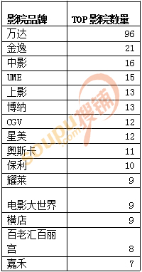 擁有TOP影院數(shù)量最多的15大影院品牌