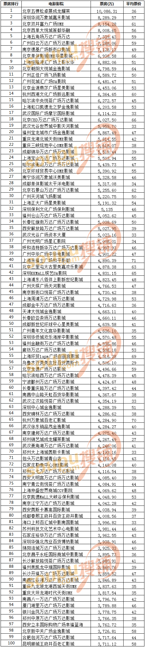 統(tǒng)計數(shù)據(jù)顯示,全國百強影院票房累計共達3711萬,其中收入6000萬以上的影院18家,4000--5000萬的影院19家,3000—4000萬的影院44家。其中票房冠軍北京耀萊影院票房為10086萬,是大陸唯一一家年票房破億的影院,而能與影院票房并駕齊驅(qū)的億級影院唯有香港朗豪坊UA影院(2015年1月被黃百鳴旗下奢華影城Cinema City接管)?傮w來看,近年來新崛起的全國TOP影院普遍具有設(shè)備頂級設(shè)施豪華和規(guī)模大型化(影廳達到10個甚至14個以上,座位數(shù)1500座以上,超過2000座的超級影城也不斷顯現(xiàn))的特點。