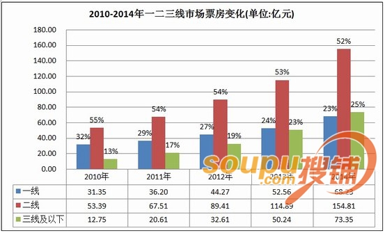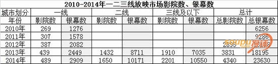 2010-2014年一二三線放映市場影院數(shù)、銀幕數(shù)