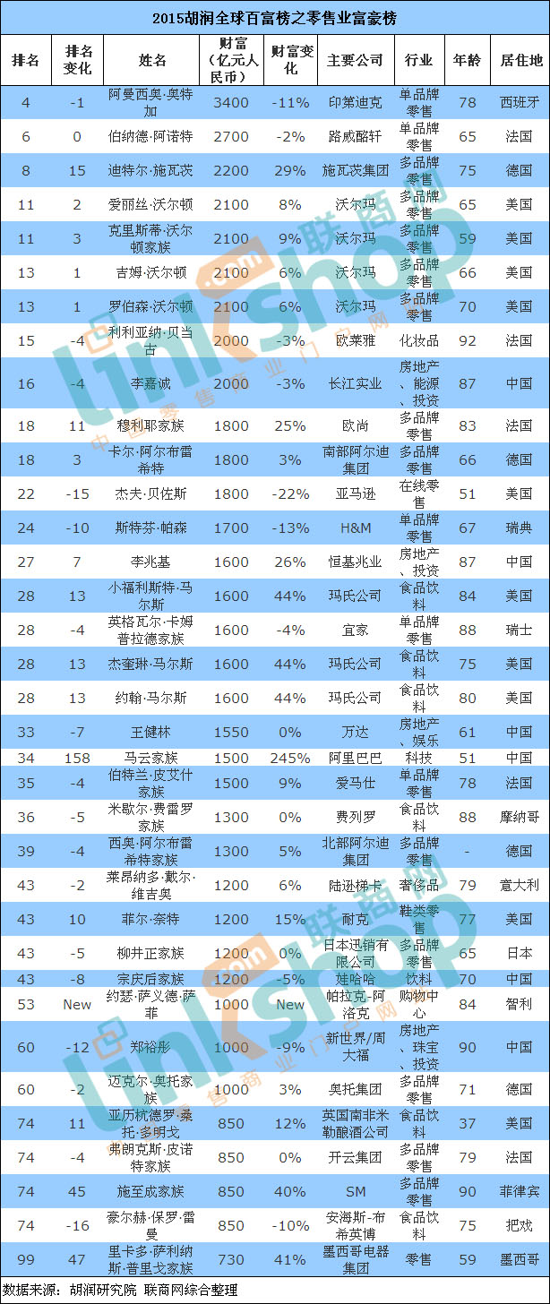 聯(lián)商網(wǎng)對上榜前100名的富豪進行了統(tǒng)計,盤點出35位涉足零售產(chǎn)業(yè)的富豪名單。ZARA母公司Inditex創(chuàng)始人西班牙的阿曼西奧·奧特加成為零售界全球首富,其個人資產(chǎn)達到3400億人民幣,財富值遠超位居第二的法國奢侈品巨頭LVMH掌門人伯納德·阿諾特。美國沃爾瑪家族成員包攬了零售富豪榜的第四至第七位,若以企業(yè)資產(chǎn)計算,沃爾瑪無疑仍是全球最大的零售企業(yè)。