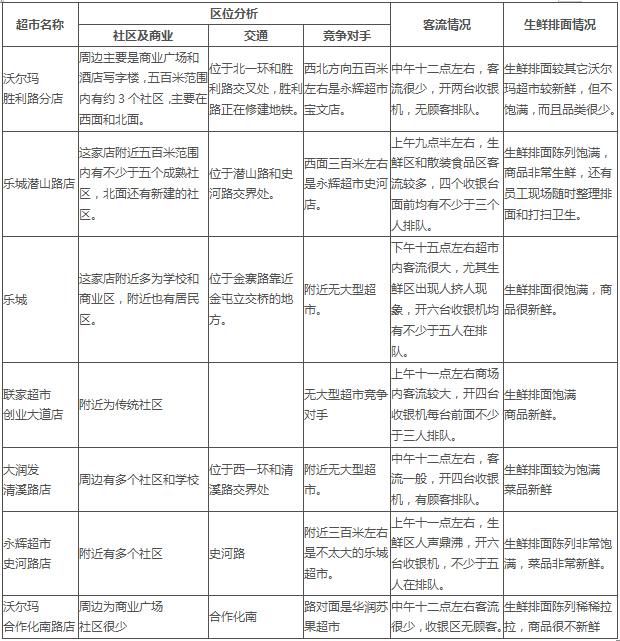 由以上分析可見,沃爾瑪為代表的傳統(tǒng)超市堅(jiān)持傳統(tǒng)的超市區(qū)位選擇方法,區(qū)位選擇著重于商業(yè)中心和交通要道,但是由于面臨商業(yè)中心和交通要道市場飽和、競爭激烈情況,面臨經(jīng)營困難的局面。而以樂城、聯(lián)家和大潤發(fā)為代表的一些超市避開商業(yè)中心和交通要道,深入社區(qū)進(jìn)行選址,取得很好效益。