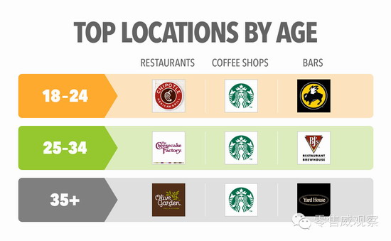 *圖2:按性別劃分,男性最喜歡去的分別是餐廳(51%)、咖啡店(31%)和酒吧(18%);女性最喜歡的分別是咖啡店(52%)、餐廳(35%)已經(jīng)酒吧(13%)。