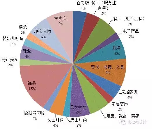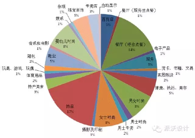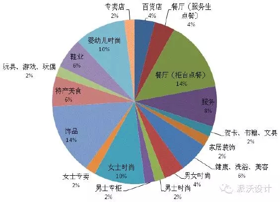 Plaza商場(chǎng)一層是整個(gè)購(gòu)物中心的核心部分,囊括了所有27種類別形態(tài)的商戶(如上圖)。其中飾品和餐廳(柜臺(tái)點(diǎn)餐)最多,分別占了17%和14%。其次,是男、女士、嬰幼兒時(shí)尚的商戶,以及珠寶首飾和高檔的百貨店。