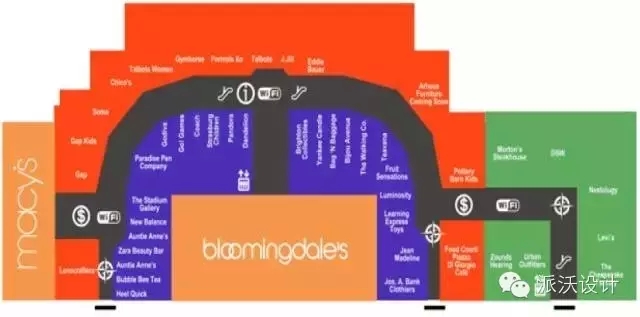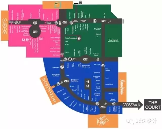 在Plaza,高檔的商店都集中靠近Lord & Taylor, Neiman Marcus和Nordstrom的南側(cè)一端,而中檔的商店基本集中在Plaza北側(cè)的靠近JCPenney和Sears的一端。