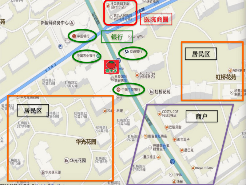 虹梅一號店主要輻射的周邊商圈有:華光花園的居民、巴黎貝甜、星巴克等商戶員工、周邊銀行有中國銀行、農(nóng)業(yè)銀行、交通銀行、工商銀行等工作人員、還有一家第九人民醫(yī)院,醫(yī)院的大夫護士及病人,這家店鋪算是一家典型的綜合性居民商圈。而馬路對面有一家虹梅路2號店正好攔截了虹橋花園的居民,這一部分顧客應(yīng)該很少有來一號店的。